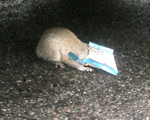 On the way to get pizza with my younger son, my wife noticed a squirrel running around the street. (See picture below.) The squirrel stayed near the car and at first we thought he was carrying a potato chip bag. Then we noticed the bag was covering his head. Baghead as my son called him, stayed near the tire and wouldn’t move. Poor Baghead.
